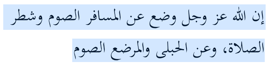 “Sesungguhnya Allah memberikan keringanan bagi orang musafir (untuk tidak) berpuasa dan (mengurangi) shalat (menjadi qashar), serta (keringanan) bagi wanita hamil dan menyusui (untuk tidak) berpuasa.” (HR. Ahmad)
