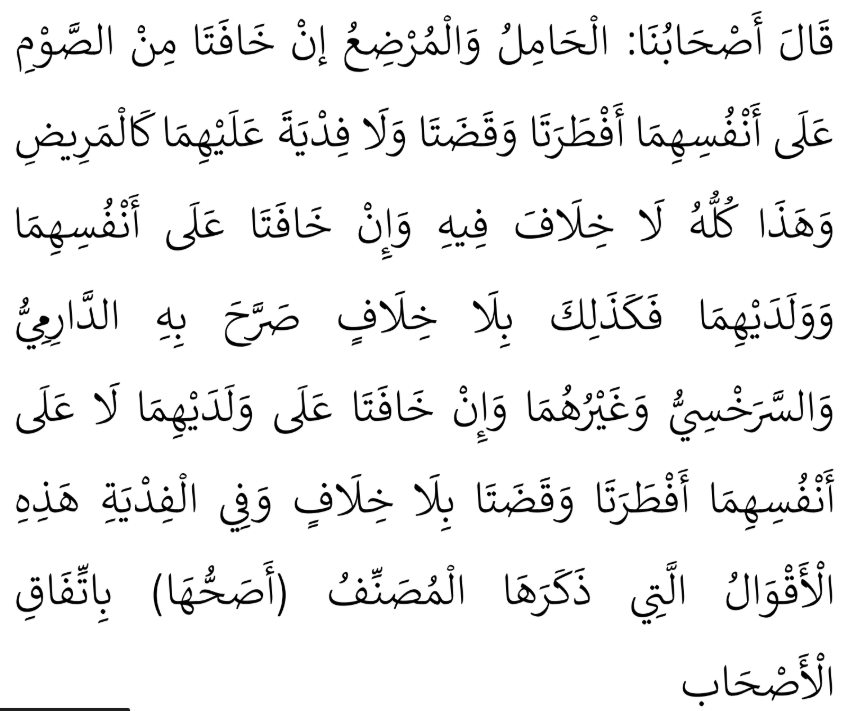 Artinya, menurut pendapat Syafi‘iyah: apabila ibu hamil dan ibu menyusui berbuka karena khawatir terhadap diri sendiri, atau khawatir terhadap diri sendiri sekaligus anaknya, maka keduanya wajib qadha tanpa fidyah dan hal ini dinyatakan tanpa khilaf. Namun apabila berbuka semata-mata karena khawatir terhadap anaknya, maka keduanya wajib qadha dan menurut pendapat yang paling kuat wajib fidyah.