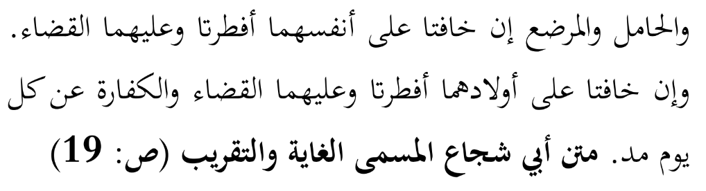 Khusus dalam Mazhab Syafi‘i, rincian hukum bagi ibu hamil dan ibu menyusui dibedakan berdasarkan sebab utama tidak berpuasanya: apakah karena khawatir terhadap diri sendiri, atau karena khawatir terhadap bayi/anak. Imam Abu Syuja‘ dalam Matn al-Ghayah wa at-Taqrib menjelaskan: