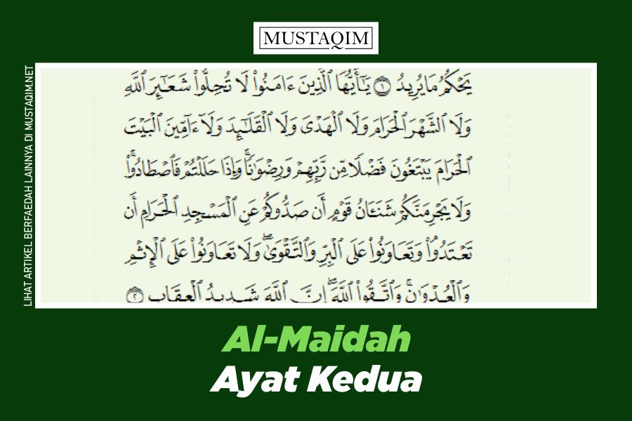 يٰٓاَيُّهَا الَّذِيْنَ اٰمَنُوْا لَا تُحِلُّوْا شَعَاۤىِٕرَ اللّٰهِ وَلَا الشَّهْرَ الْحَرَامَ وَلَا الْهَدْيَ وَلَا الْقَلَاۤىِٕدَ وَلَآ اٰۤمِّيْنَ الْبَيْتَ الْحَرَامَ يَبْتَغُوْنَ فَضْلًا مِّنْ رَّبِّهِمْ وَرِضْوَانًا ۗوَاِذَا حَلَلْتُمْ فَاصْطَادُوْا ۗوَلَا يَجْرِمَنَّكُمْ شَنَاٰنُ قَوْمٍ اَنْ صَدُّوْكُمْ عَنِ الْمَسْجِدِ الْحَرَامِ اَنْ تَعْتَدُوْۘا وَتَعَاوَنُوْا عَلَى الْبِرِّ وَالتَّقْوٰىۖ وَلَا تَعَاوَنُوْا عَلَى الْاِثْمِ وَالْعُدْوَانِ ۖوَاتَّقُوا اللّٰهَ ۗاِنَّ اللّٰهَ شَدِيْدُ الْعِقَابِ2